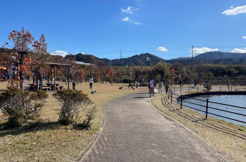 芝生広場のすぐ隣には、大きな池を囲むように整備された遊歩道があります。
