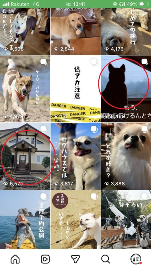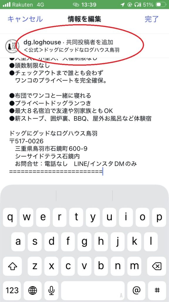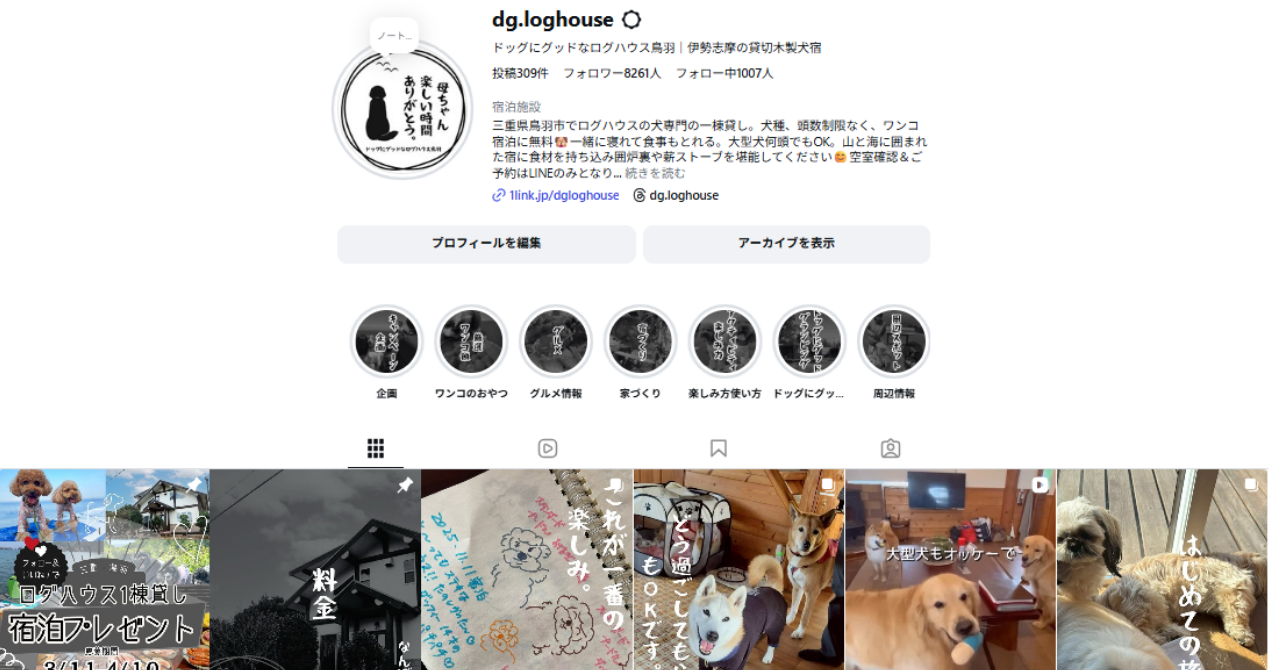 共同投稿にすると、たくさんの人に投稿を見てもらうことができフォロワーが増える可能性があります。ドッグにグッドなログハウス鳥羽では、お客様の投稿はこんな風に掲載されます。