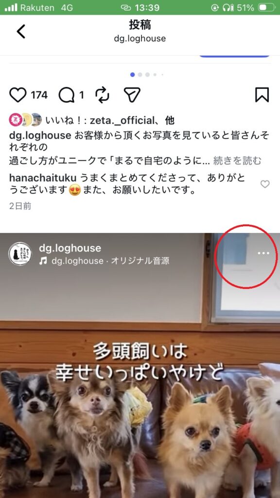 1. 自分の投稿を表示し、右上の 「…」 をタップ。