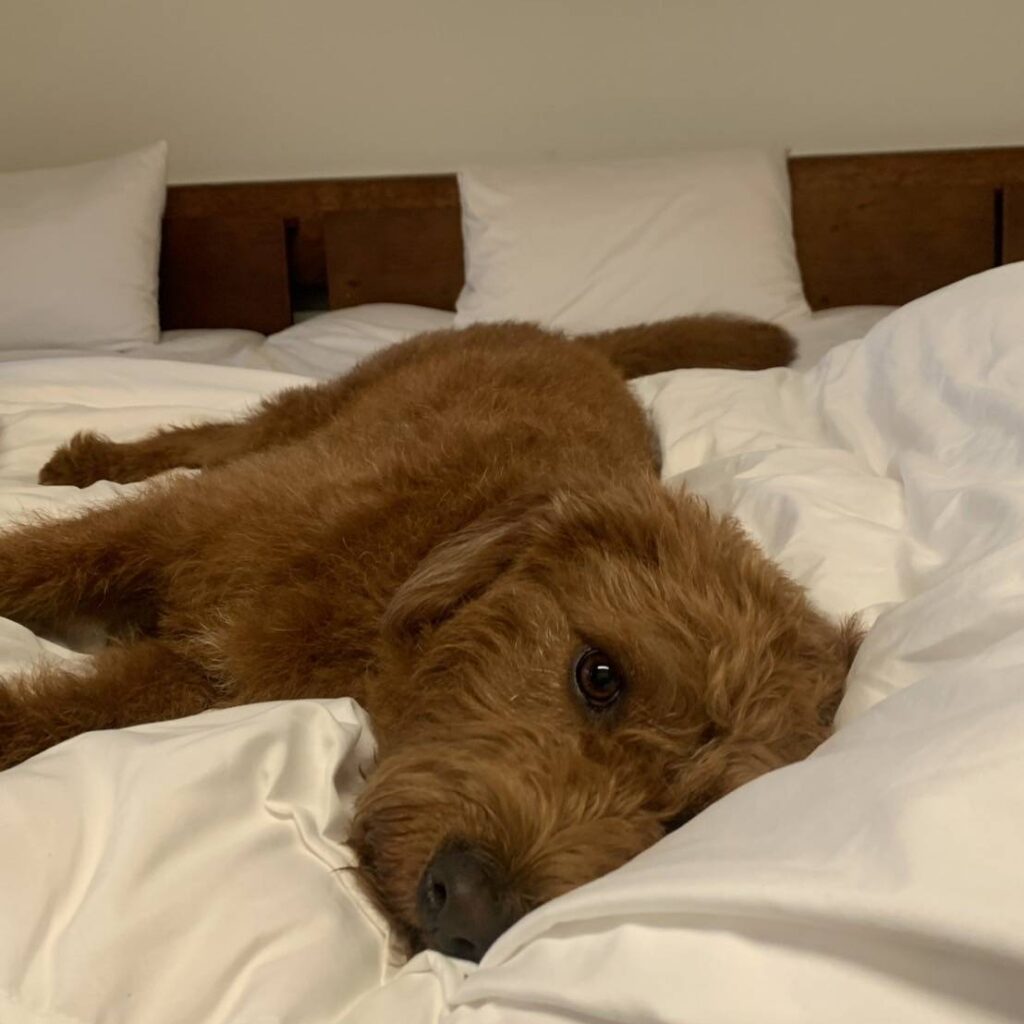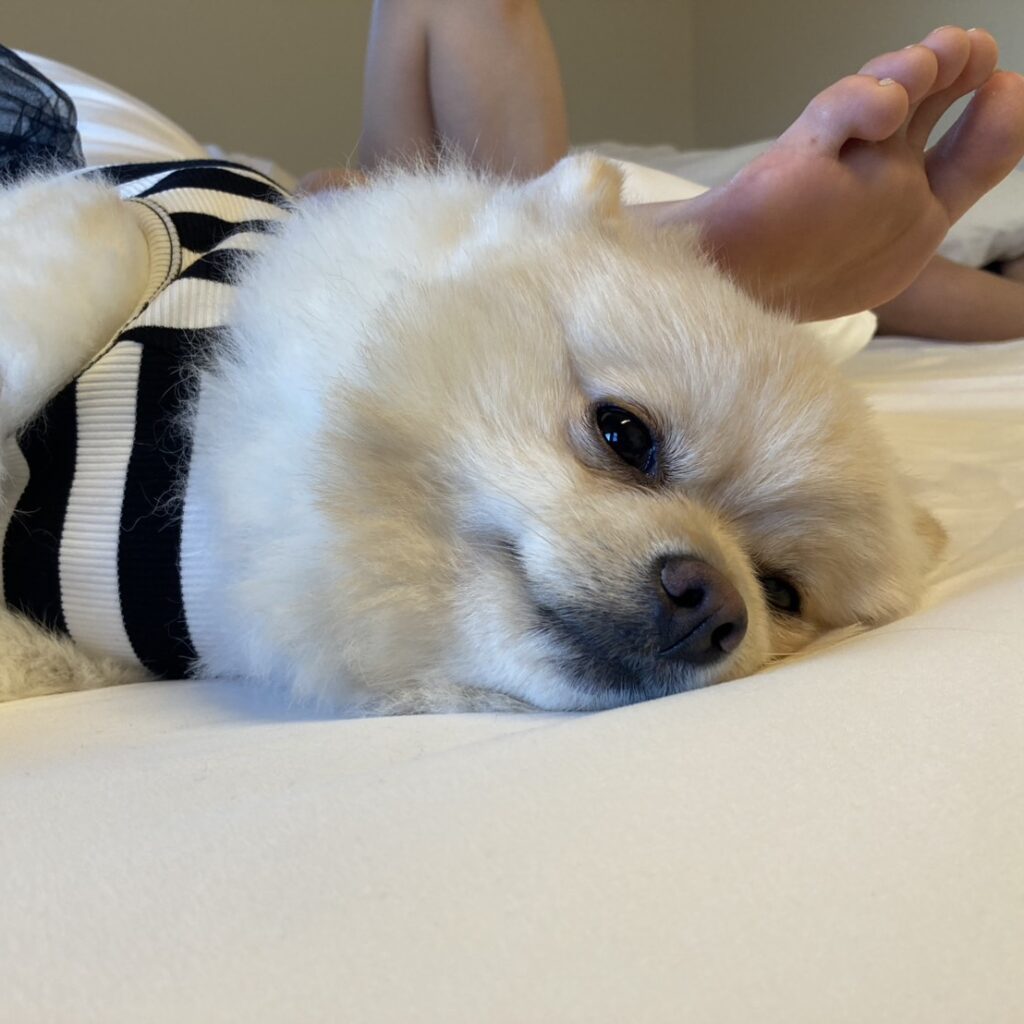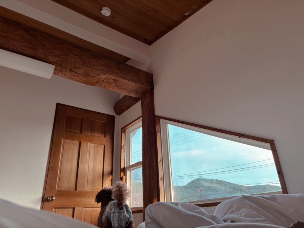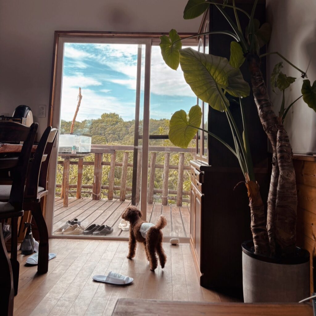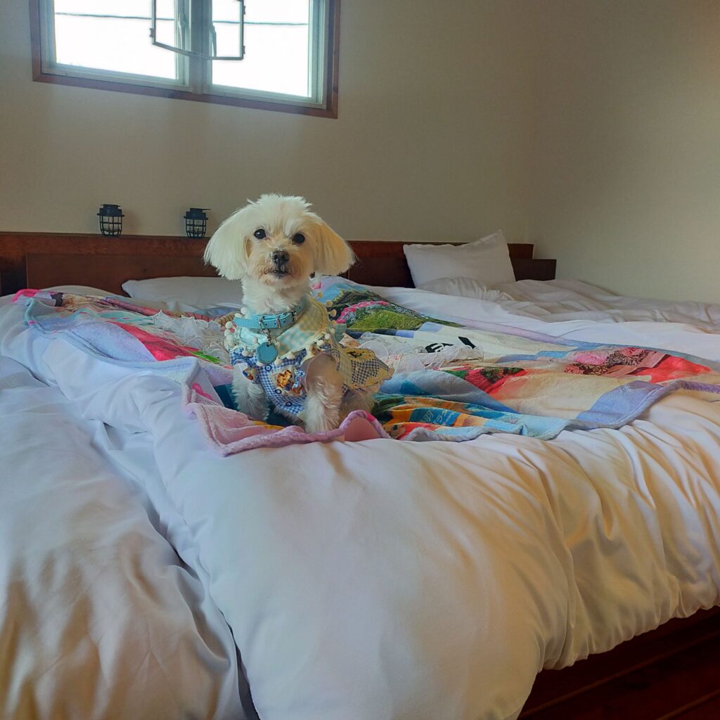 ログハウスの寝室は、木の質感を活かしたシンプルなデザインで、心が落ち着く空間を演出します。余計な装飾を排し、無垢材の美しい木目と柔らかな色合いが、心地よい眠りへと誘います。ワンコはノーゲージでベットで添い寝も可能。ワンコがストレスなく甘えられるように仕上げています。
