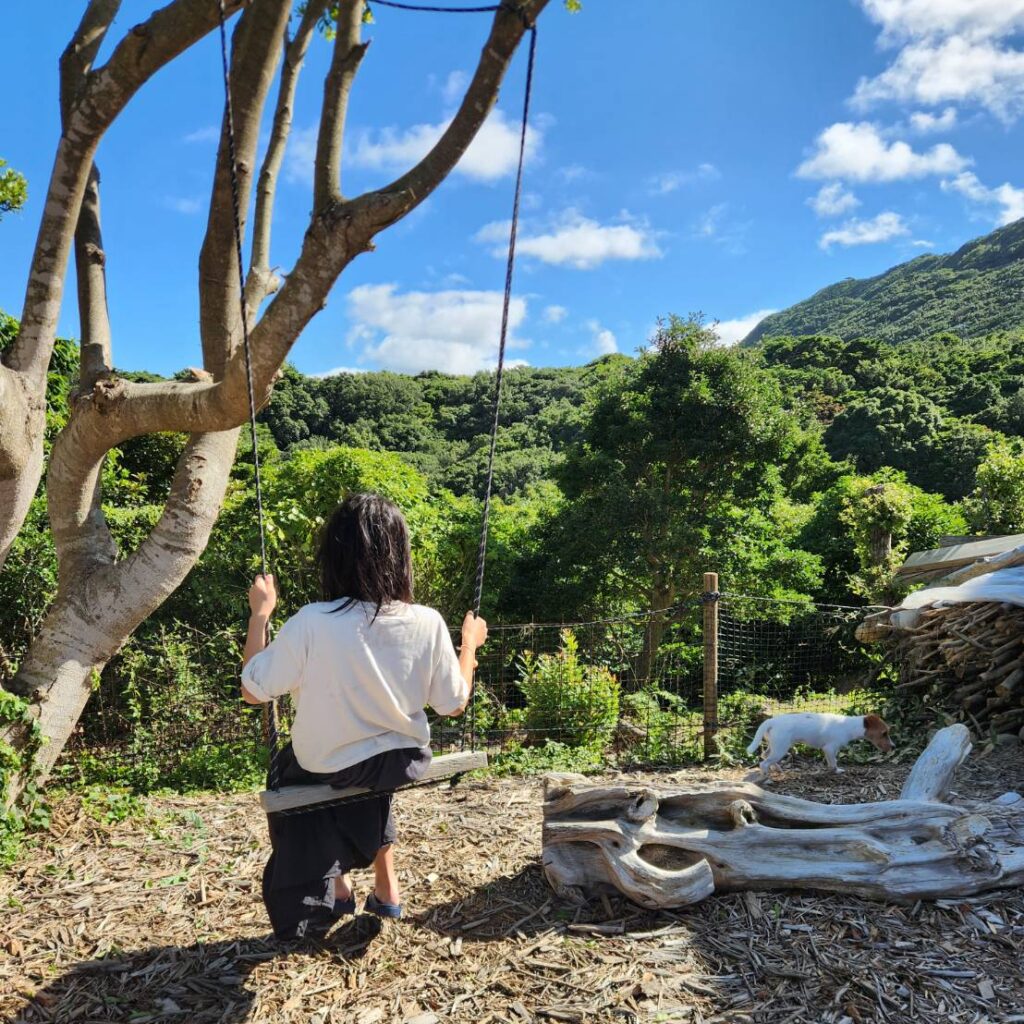 ウッドデッキから直通でいけるドッグランは、広さ120㎡でワンコが自由にドッグランに遊びに行けるように設計。飼い主様は木陰でワンコを眺めたり、ハンモックでゆっくりしたりとできるフリースペースです。近くの果樹園は現在育成中で、梅や栗、柿やレモンなどを植樹しています。
