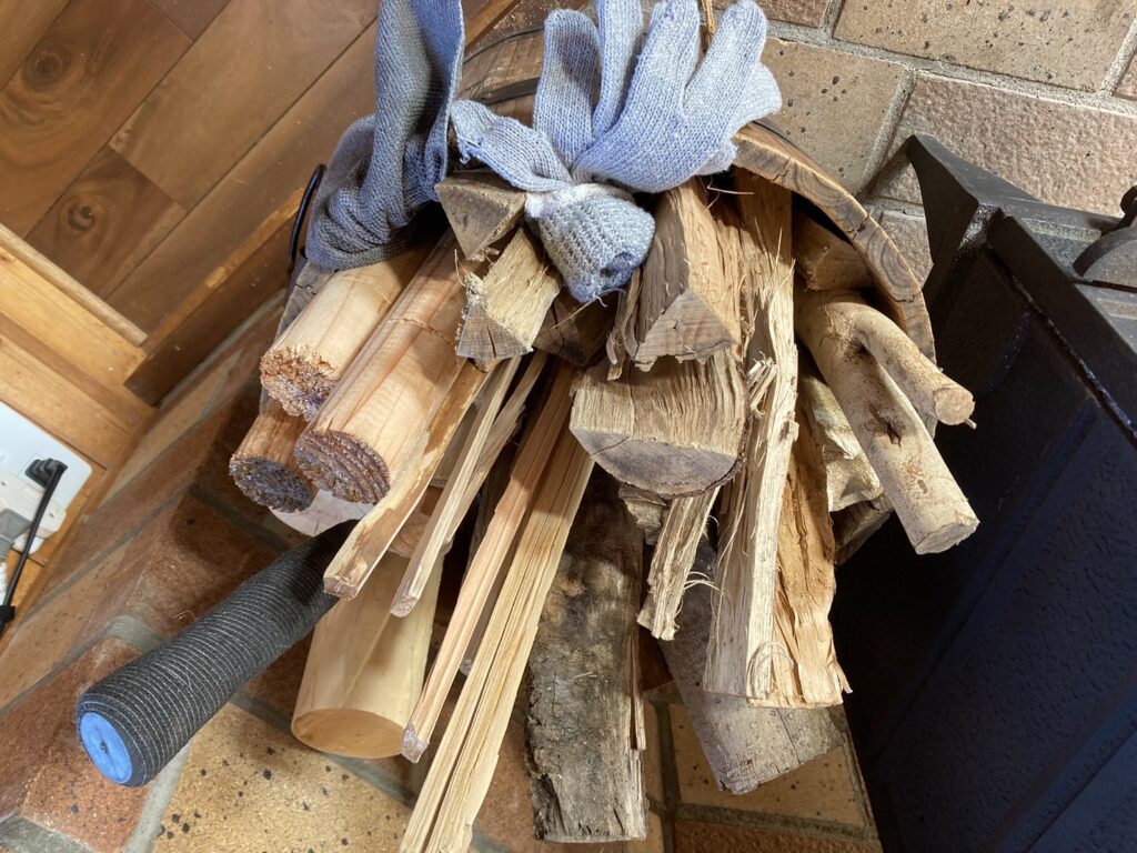 焚き付け準備には、チャッカマン、着火剤(バーナーファイヤースターターなど)、細い薪、中サイズの薪、大サイズの薪が必要です。集成材や合板など接着剤を使った薪は使用できません。